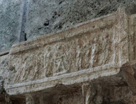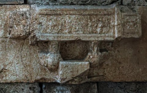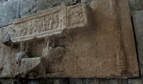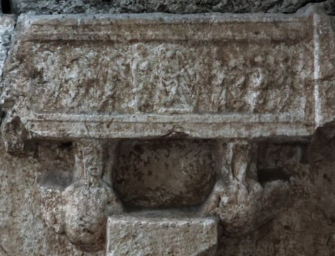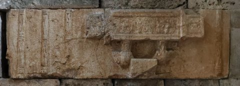 - Reliefblock mit einer von Rutenbündeln (fasces) flankierten sella curulis mit Reliefs auf der Vorderseite des Sitzes (Szene mit Amtshandlung, seitlich je ein Feld mit Profilkopf, unten figürliche Stützen).