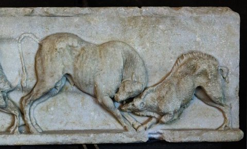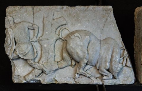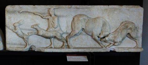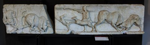 - Jagdszenen: auf dem linken Fragment nach links laufender Jäger mit Speer, Baum, zusammenbrechender Stier (?); auf dem größeren Fragment Jäger mit Jagdhund, der einen Hasen verfolgt, rechts Stier und Hund.