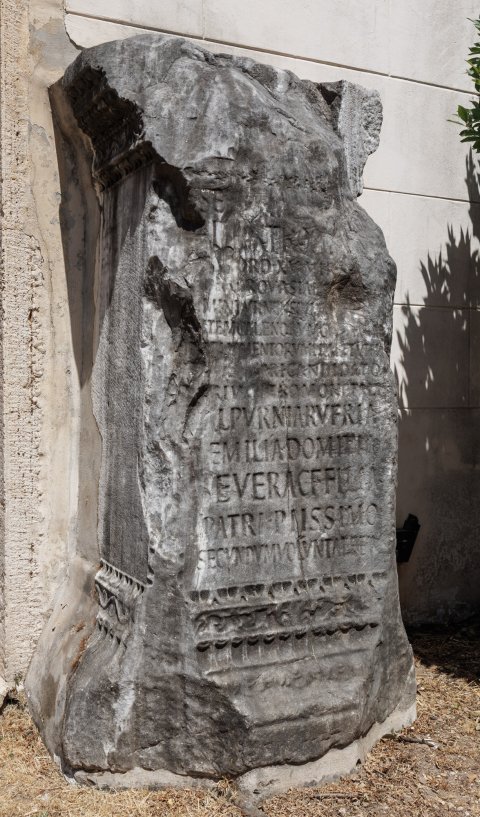 - Se[r(vio)] Cal[pu]r[nio] / Dextro c(larissimae) m(emoriae) [v(iro)] / co(n)[s(uli)] ord(inario) XVvir(o) s(acris) [f(aciundis)] / leg(ato) prov(inciae) Asiae c[ur(atori) rei p(ublicae)] / Minturnensium V[enafr]an(orum) / item Calenorum cur(atori) viae Ae[m(iliae)] / et alimentorum praet(ori) tutel(ario) / [q]uaestori candidato / triumviro monetali / Calpurnia Rufria / Aemilia Domitia / Severa c(larissima) f(emina) filia / patri piissimo / secundum voluntate(m) eius