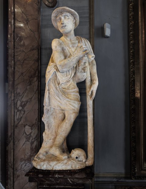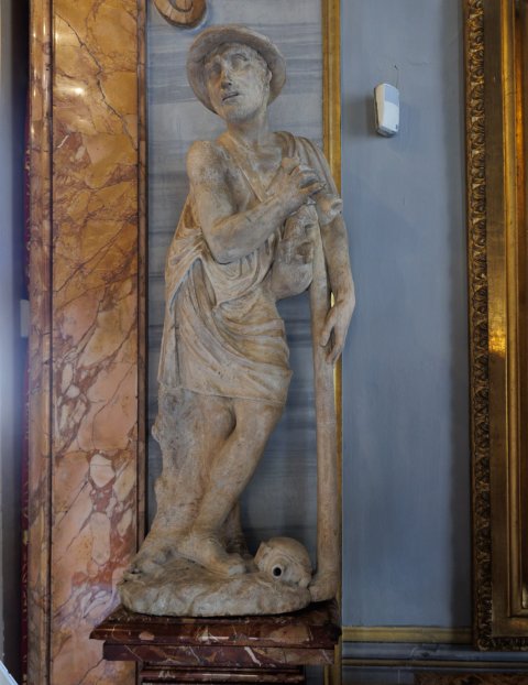 - Auf einen langen Stock gestützter Hirte mit Hut und Beutel über der linken Schulter; kurzer Chiton (Exomis), hinter dem rechten Bein Baumstammstütze.
