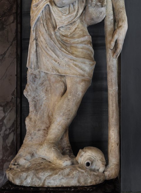 - ergänzt: Nase, rechter Arm, linker Unterarm mit Hand, Stock, Unterschenkel u. Füße. Plinthe mit Krug u. Eidechse