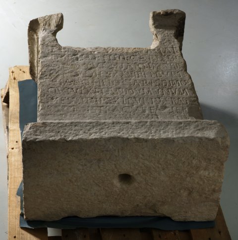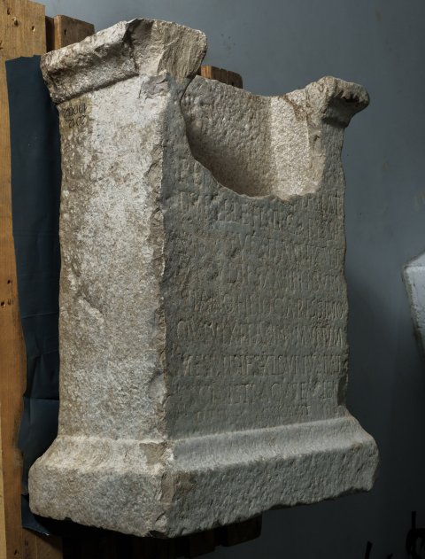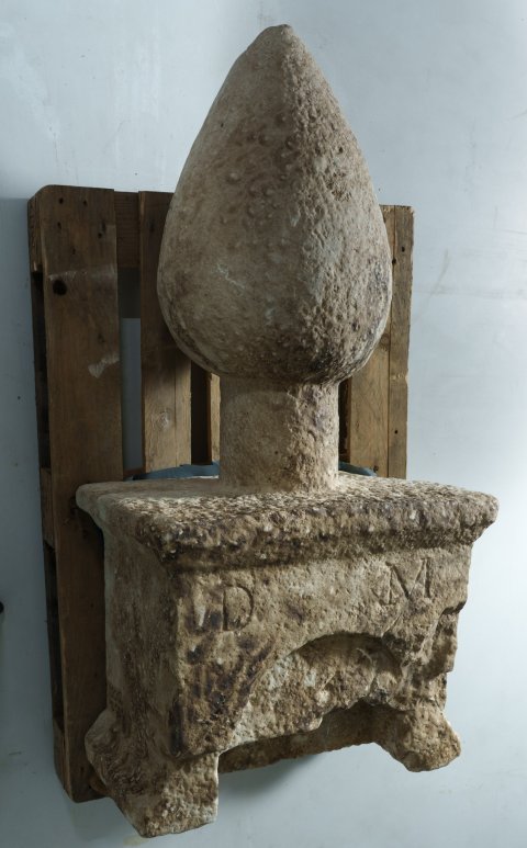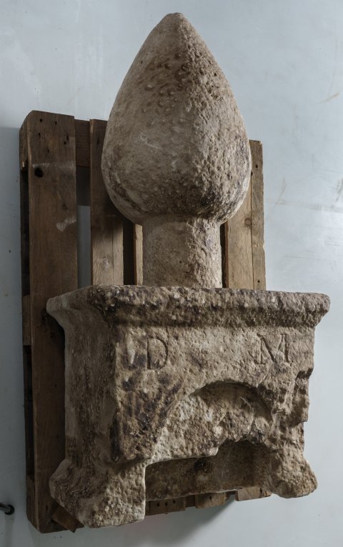- Als Bekrönung Pinienzapfen, oberhalb der Inschrift Bogennische, die (sekundär ?) nach unten zu tiefer ausgehöhlt wurde.