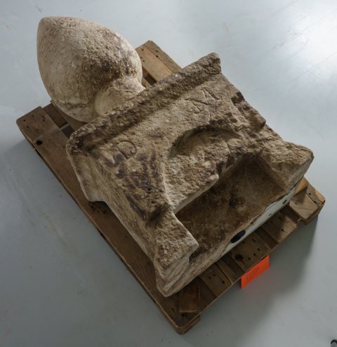 - in 2 Teile gebr., Inschrift verrieben, tief ausgehöhlte Bogennische, in der Unterseite rundes Dübelloch, Sockel fehlt