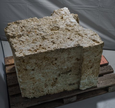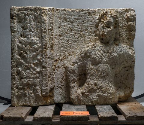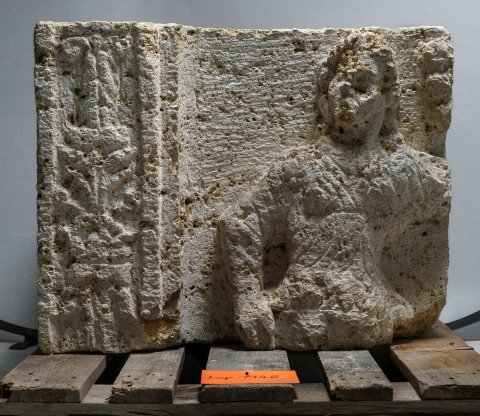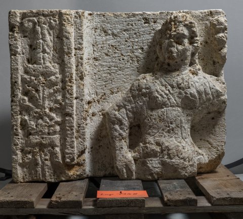 - rechts u. unten abgebr., oben u. hinten auf Anschlluss gearbeitet, in der Oberseite Klammerloch nach hinten; Relief bestoßen