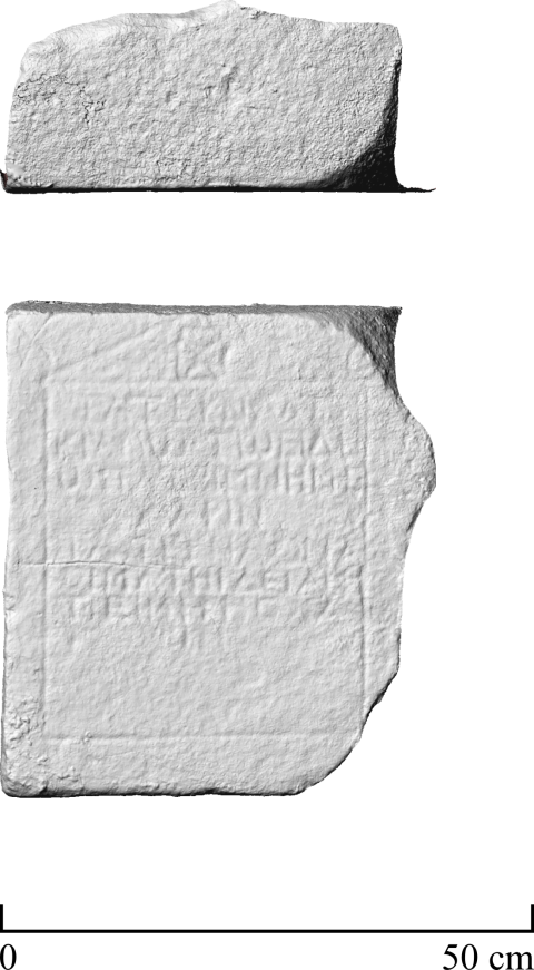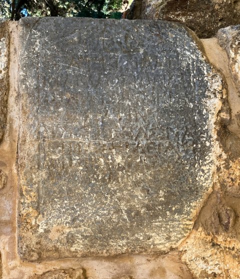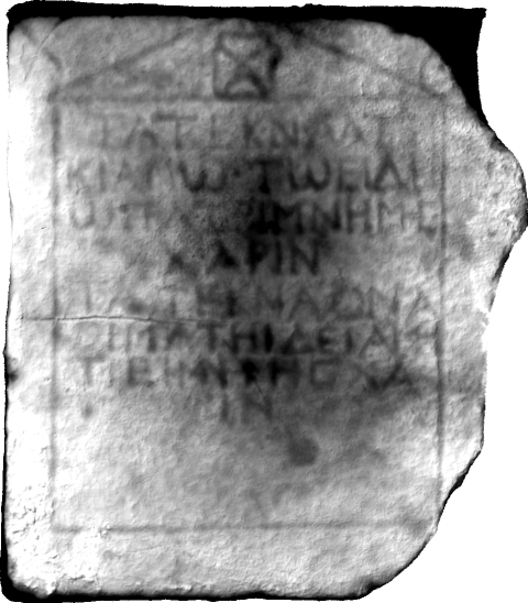 - griechisch: τὰ τέκνα Δε/κιανῷ τῷ εἰδί/ῳ πατρὶ μνήμης / χάριν / τὰ τέκνα Ὀνα/σίμῃ τῇ ἰδείᾳ μη/τρὶ μνήμης χά/ριν
