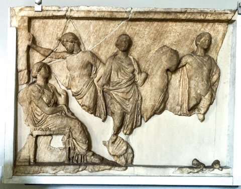 - Mythische Figuren: links sitzende Göttin, ihr zugewandt stehender jugendlicher Gotti, anschließend frontal stehende Göttin in Chiton und Mantel, zu ihrer Linken jugendlicher Gott mit Pferd (Dioskur ?).
