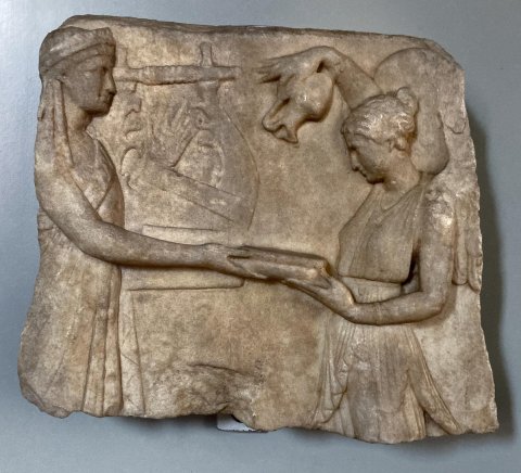 - Mythische Figuren: nach links hin ausschreitende Nike, in der linken Hand Schale, in die sie mit erhobener Rechter eine Kanne ausgießt. Ihr gegenüber Apollo mit archaistischer Frssur, im linken Arm Kithara, die Rechte fasst die Schale. Nach ganz erhaltene Reliefs folgen Leto und Artemis.