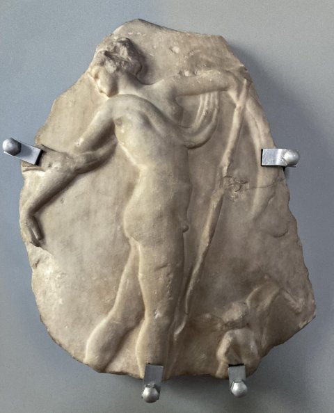 - Tanzender nackter Hermaphrodit mit zurückgewandtem Kopf, in der Rechten Spiegel, in der Linken Thyrsosstab, unten vor ihm Erot. Teil eines Thiasos.
