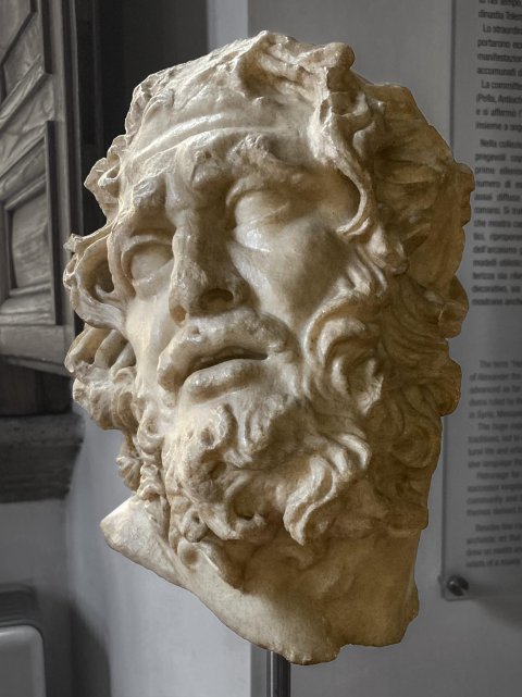 - Kopf eines alten Kentauren mit zurückgebeugtem Kopf. Teil einer Gruppe mit einem jugendlichen heiteren und einem alten leidenden Kentauren, beide von einem Eroten vorwärtsgetrieben.