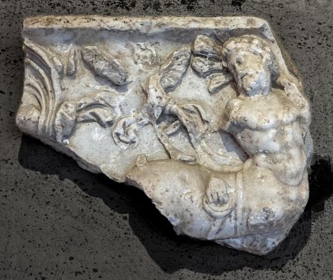 - Mythische Figur: nach rechts bewegter bärtiger Kentaur mit zurückgewandtem Kopf, über seinem Rücken Reliefreste (Gewandfalten, fliegender Erot ?); links Figur mit velumartigem Mantel. Thiasos ?