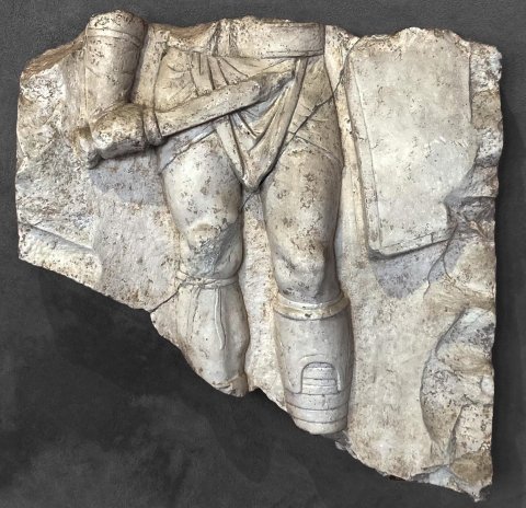 - frontal stehender Gladiator mit Schwert, Beinschutz und eckigem Schild (myrmillo)