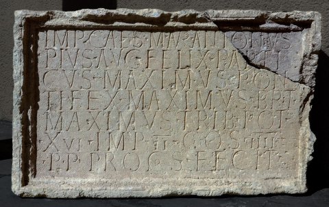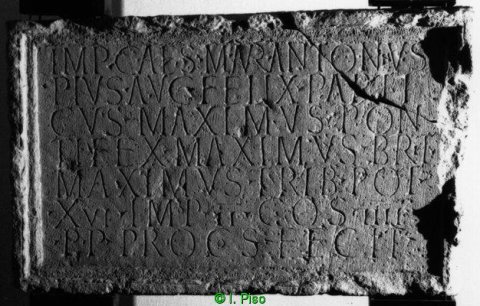 - Imp(erator) Caes(ar) M(arcus) Aur(elius) Antoninus / Pius Aug(ustus) Felix Part(h)i/cus maximus pon/tifex maximus Brit(annicus) / maximus trib(unicia) pot(estate) / XVI imp(erator) II co(n)s(ul) IIII / p(ater) p(atriae) proco(n)s(ul) fecit