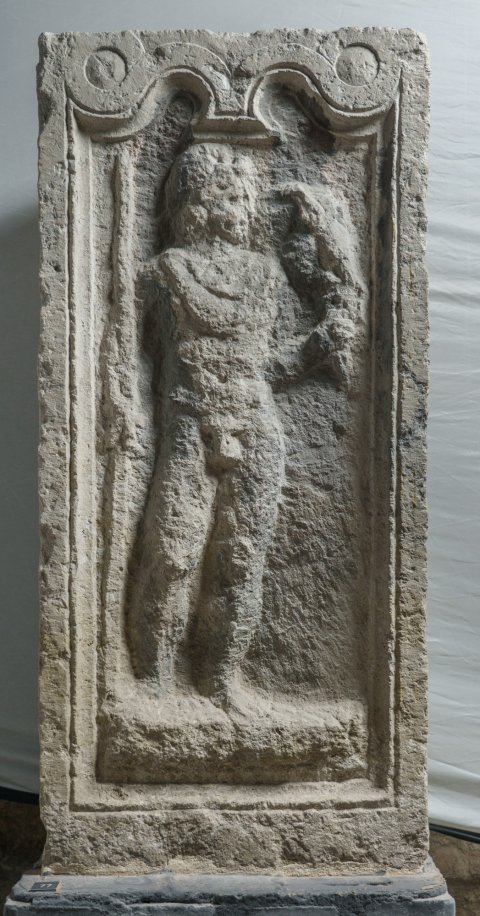 - Mythische Figur: unter Doppelbogen steht auf flachem Podest Dioskur mit Kappe und Mantel um die Schultern, in der Rechten Lanze, die Linke hält Zügel des Pferdes links neben ihm.