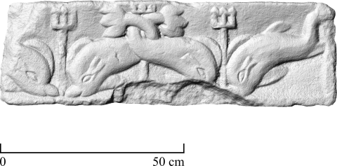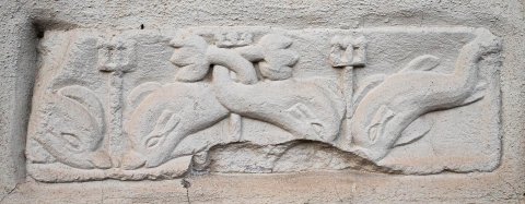 - Vier Delphine, die beiden mittleren mit umeinander und um Dreizack geschlungenen Schwänzen, die äußeren schwimmen zur Mitte hin auf Dreizack zu.