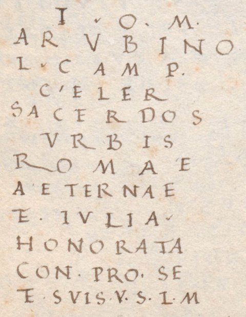 - I(ovi) o(ptimo) m(aximo) / Arubiano / L(ucius) Camp(anius) / Celer / sacerdos / urbis / Romae / aeternae / et Iulia / Honorata / con(iux) pro se / et suis v(otum) s(olverunt) l(ibentes) m(erito)