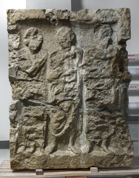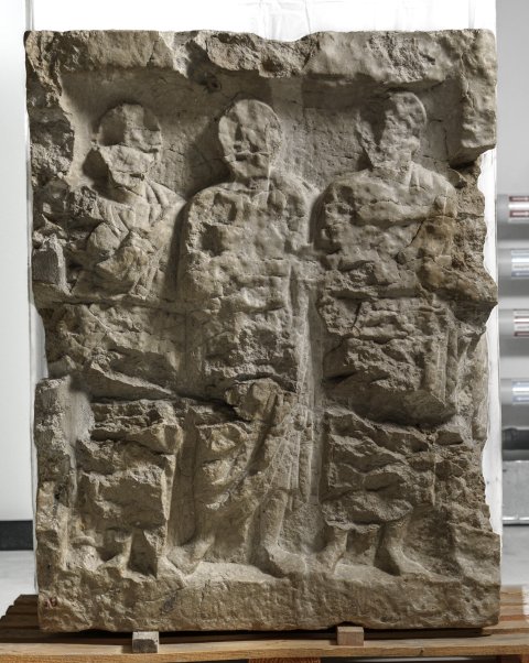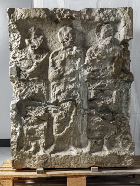 - horizontaler Bruch, Relief der Vorderseite abgeschlagen, Kanten verbr.