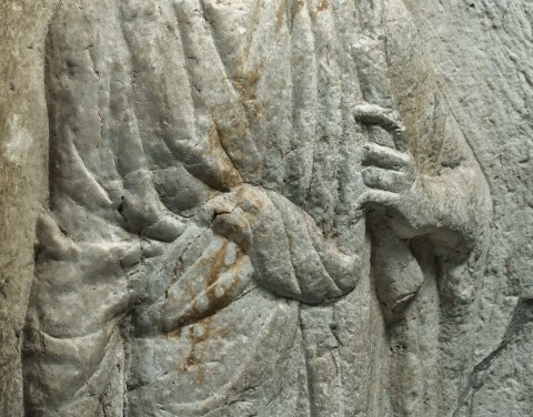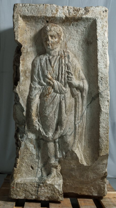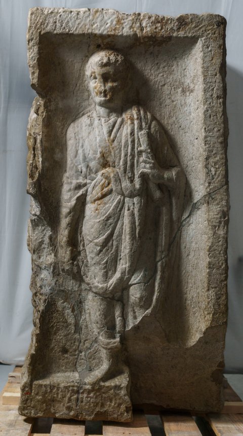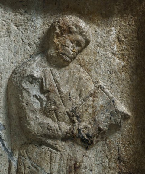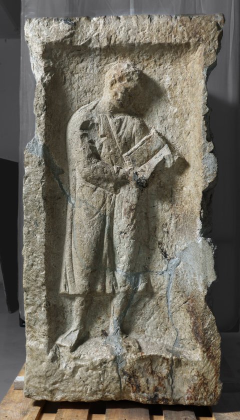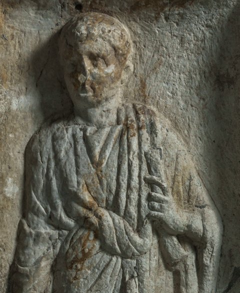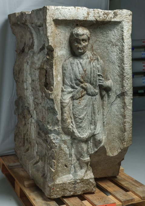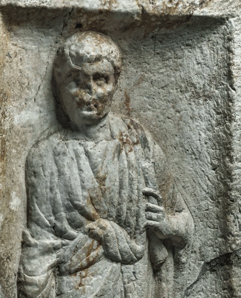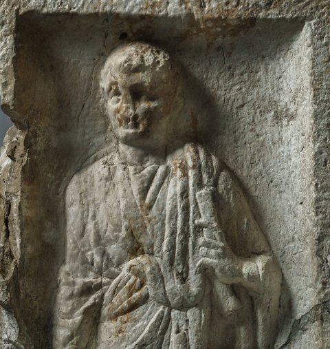 Auf der rechten Nebenseite in Rechtecknische stehender Mann in Tunica und Toga, in der Linken Rolle (volumen). - Kommentar