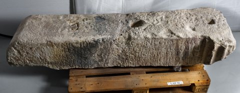 - stark verwittert, in der Oberseite Dübellöcher, unten u. seitlich abgebr., ursprüngl. auf beiden Seiten Pilaster erhalten u. Inschrift gut lesbar