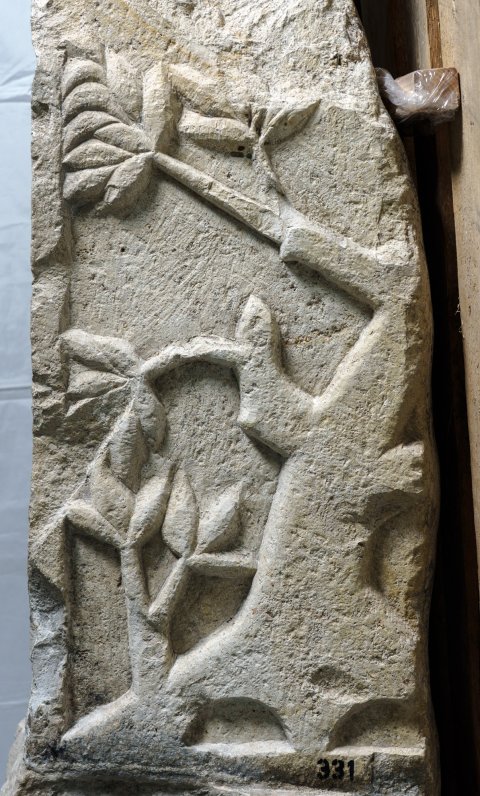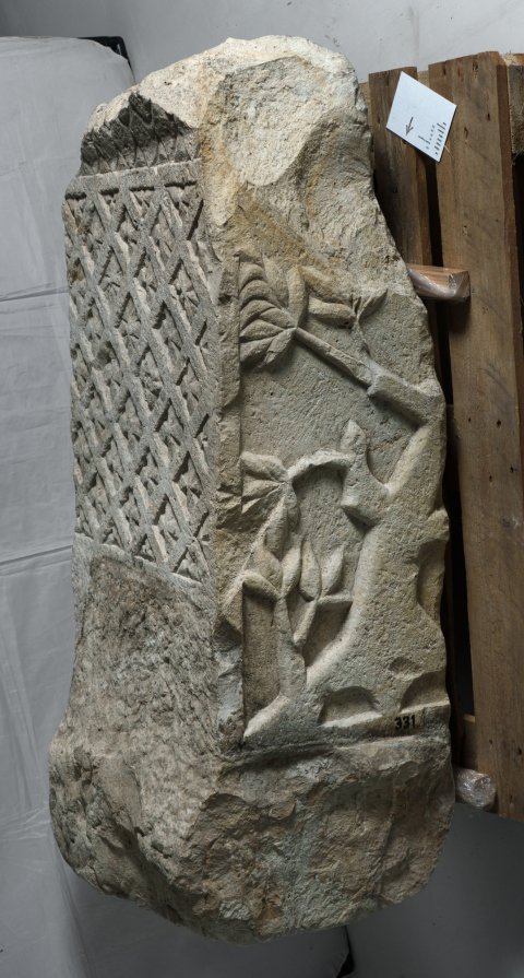 Auf der Rückseite Rautengitter mit Rosetten in den Rauten. Oben Ansatz einer geschuppten Zone. - Inschrift