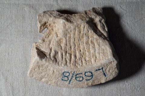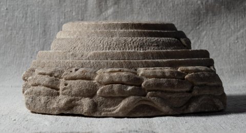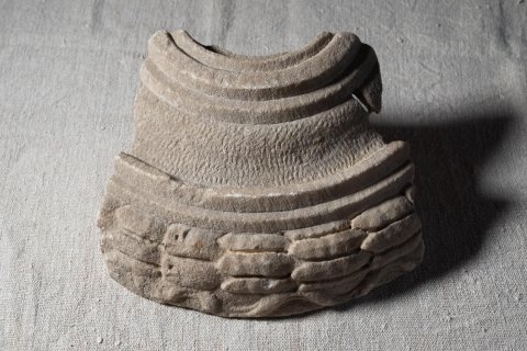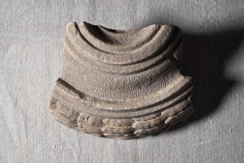 rundes, deckelartiges Fragement mit umlaufender Profilierung. Außen Lorbeerkranz.
