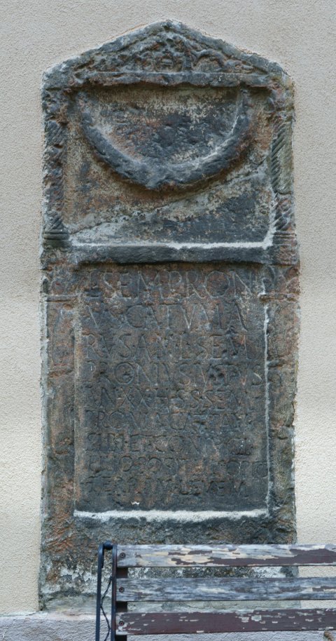 - L(ucius) Semproni/us Catuma/rus an(norum) L Sem/pronius Iustus / an(norum) XX h(ic) s(iti) s(unt) Sem/pronia Catta v(iva) / sibi et coniugi / (et) filio pos(u)it his opto / terram levem