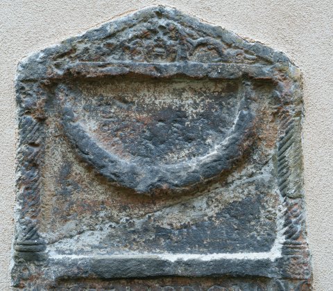 Im Hauptbild Girlande zwischen Säulen mit Spiralkanneluren. - Inschrift