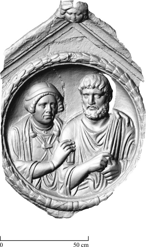 - In Lorbeerkranzrahmen mit Tänien zwei Halbfiguren (Ehepaar). Links einheimische Frau: Haube, Umhang, Doppelknopffibeln, auf der Brust Fibel, Halsreif mit Lunula, Armreif. Rechts Mann: bärtig, hadrianische Frisur, Tunica, Toga, in der Linken Rolle (volumen), Fingerring. Über dem Medaillon Giebel mit Gorgoneion.