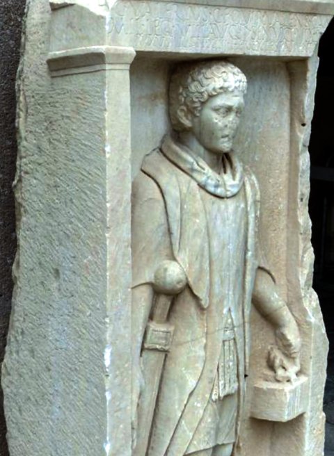 - Steiles Giebeldach mit zylindrischem First und Ansätzen von Eckakroteren (?), im Giebelfeld eckiger Schild. Eingetiefte Bildnische zwischen glatten Pilastern. Stehende Ganzfigur eines bartlosen Soldaten mit kurzen Locken, bekleidet mit Halstuch, Paenula, kurzer Tunica, in der Rechten Stock, in der Linken zusammengeklapptes Polyptychon (?). Waffen: Gürtel mit Streifenschurz, an der rechten Hüfte Schwert (gladius), an der linken Dolch.