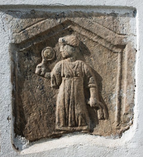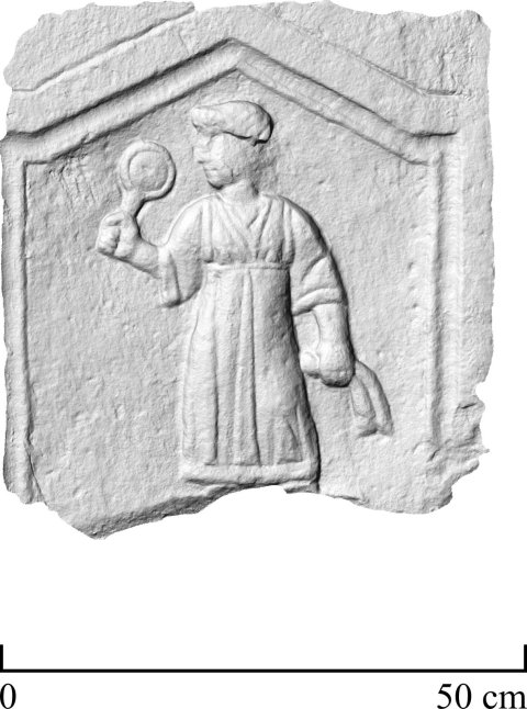 - Dienerin: unter Giebel auf niedrigem Podest einheimisches Mädchen mit Unter- und Obergewand, Gürtel, in der Rechten Spiegel, in der Linken mappa.