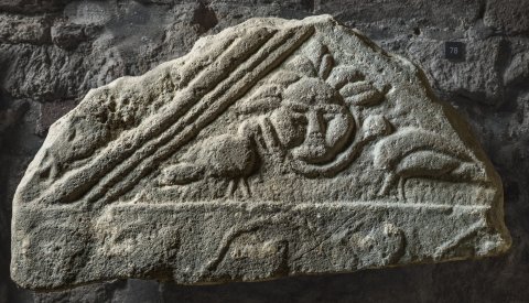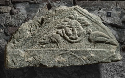 - Eingeschriebener Giebel mit profiliertem Rahmen, im Giebelfeld Gorgoneion zwischen Vögeln, auf den Schrägen Delphine, auf der unteren Rahmenleiste Ranke.