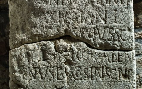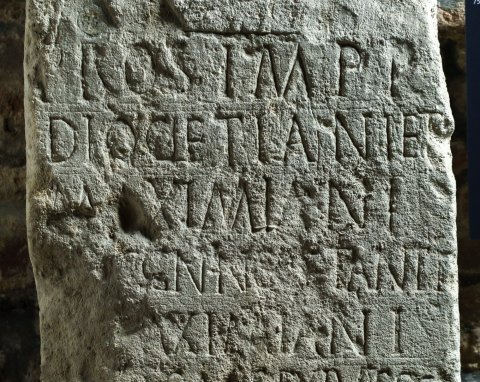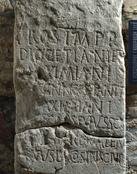 - Pro s(alute) Impp(eratorum) / Diocletiani et Maximiani / Augg(ustorum) nn(ostroum) Co(n)stanti / et Maximiani / nob(ilissimorum) Caes(arum) ex iusso (!) / [---] Barb(ius) Valen/tinus b(ene)f(iciarius) co(n)s(ularis) insc(ribente) iub(ente)