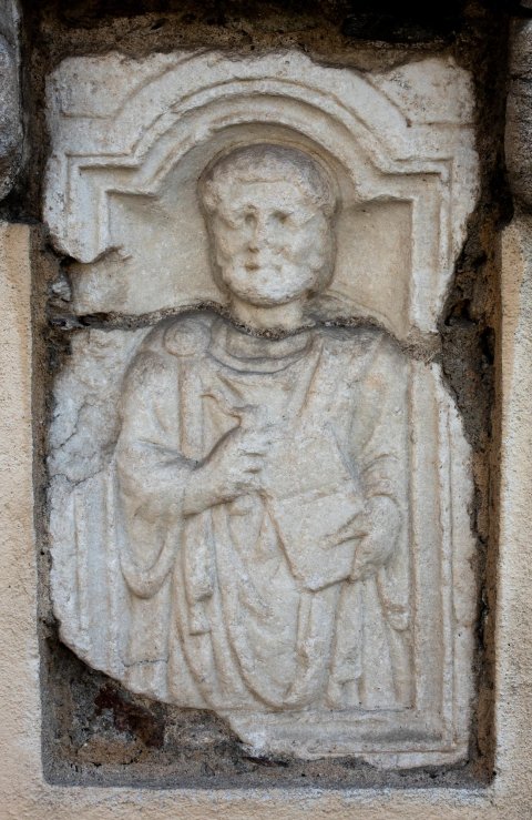 - Mann (Soldat ?, Librarius - Scriba): in Bogennische frontal stehenden Mann: bärtig, Locken, Tunica, Sagum, Scheibenfibel, hält aufgeklapptes Diptychon vor sich, in der Rechten Stilus mit Bändchen.
