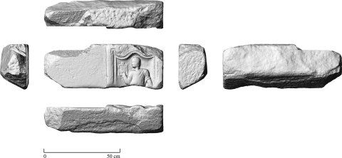 - Diener (Librarius - Scriba): Rechts Bildfeld mit profiliertem, oben geschwungenem Rahmen. Mann in Tunica, in der Rechten Schreibtafel. Links anschließend leeres Feld (Inschrift nicht ausgeführt ?).